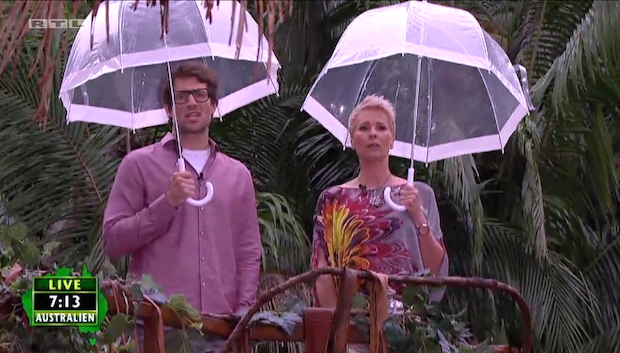Hartwich: „Da sind wir wieder, diesmal nicht nur im Dschungel sondern auch im Regenwald. Nur die Brigitte, die war nicht so begeistert von dem Unwetter. Sie sagt, 2012 sei das viel spektakulärer gewesen.“