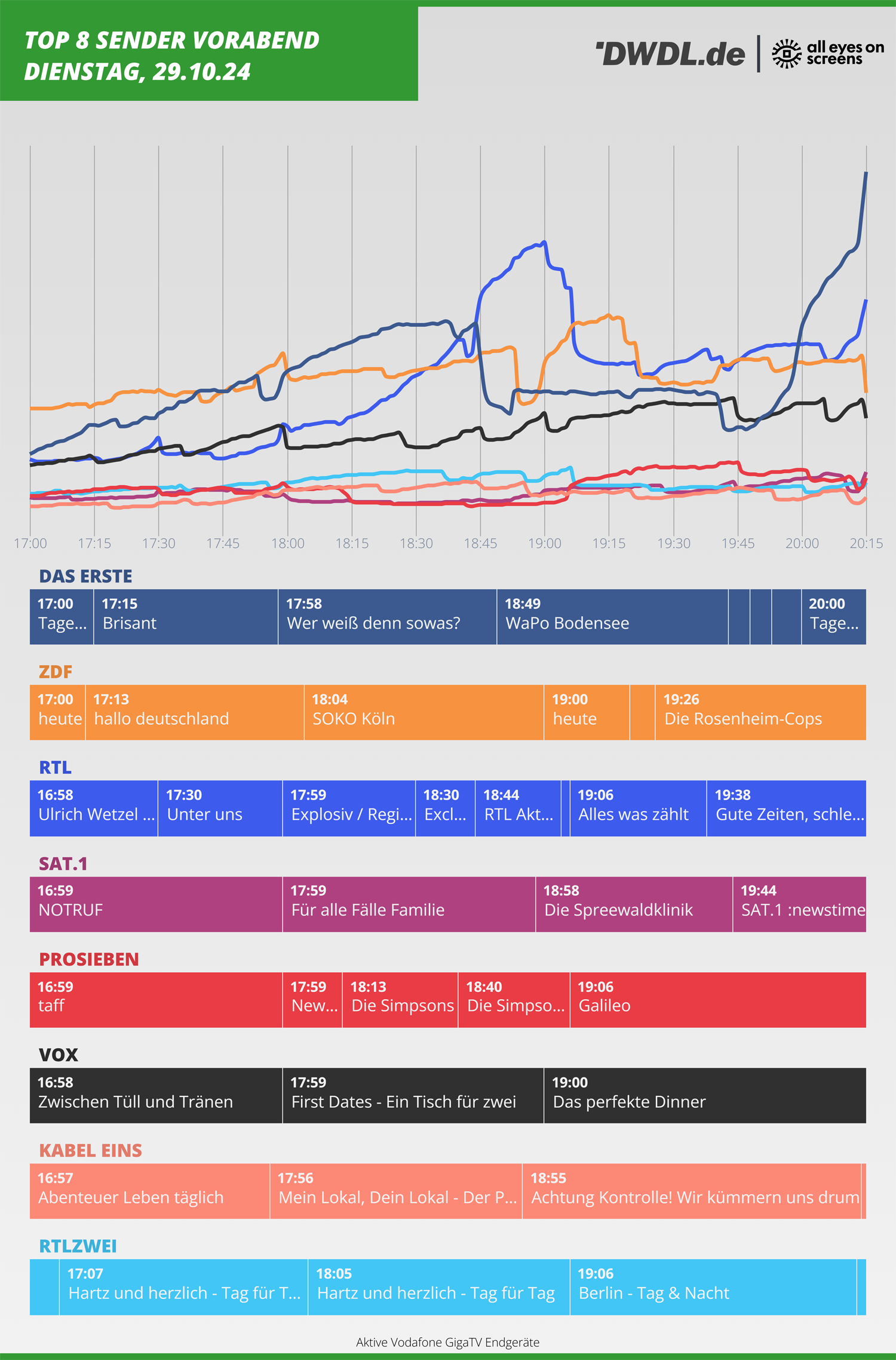 Wichtig bei allen All Eyes on Screens-Kurven: Sie sind, anders als die AGF-Zahlen, nicht bevölkerungsrepräsentativ. Sie werden also nicht anhand eines Panels gewichtet und hochgerechnet, sondern geben die tatsächlich gemessenen Gerätedaten aus rund einer Million von insgesamt 13 Millionen Vodafone-Haushalten wieder. Mehr Hintergrund zu diesen Daten gibt es hier. Aussagekräftig sind somit weniger die Höhe der Reichweitenkurven zueinander als die Entwicklung innerhalb eines Senders und die Erkenntnisse zu Umschaltzeitpunkten.