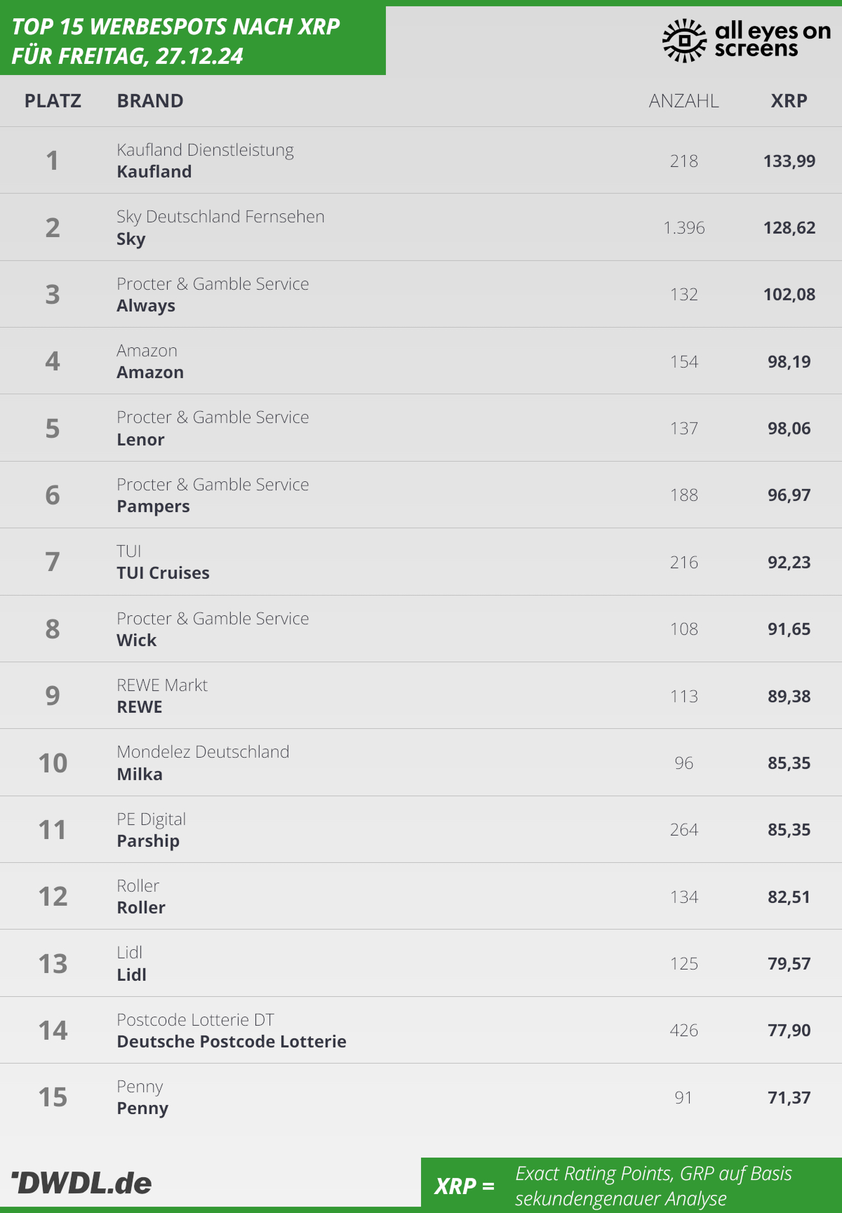 All Eyes on Screens stellt für das Ranking eine Liste aller gestern im deutschen TV ausgestrahlten Werbespots zusammen und ermittelt für diese die in Summe erzielte Reichweite aller Spots einer Marke in den gemessenen Vodafone-Haushalten. Da hier die sekundengenaue Reichweite statt der bislang branchenüblichen Werbeinselreichweite als Grundlage dient, spricht All Eyes on Screens von XRP (Exact Rating Points). Da es sich um Brutto-Reichweiten handelt, werden dafür die Einzel-Reichweite jeder Ausstrahlung aufaddiert. Zur Veranschaulichung: Läuft ein Spot zehn Mal und erreicht dabei jeweils fünf Prozent der gemessenen Vodafone-Haushalte, ergibt das für den gesamten Tag 50 XRP - auch wenn es immer die gleichen fünf Prozent gewesen wären.