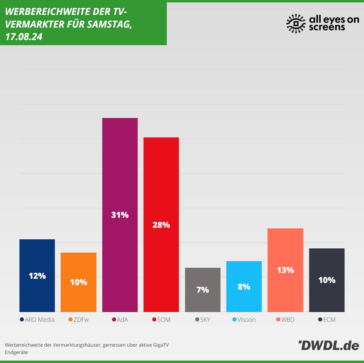 Über 1100 Spots für das Sky-Angebot waren am Samstag im Fernsehen zu sehen, die überwiegende Anzahl davon übrigens auf den eigenen Sky-Sendern. Mit über 97 XRP sicherte sich Sky nun den Spitzenplatz, was sich auch damit erklären lässt, dass Sky Sport am Samstag rund zehn Stunden lang Live-Fußball bestehend aus Pokal- und Supercup-Partien zeigte. Im Rahmen der Übertragungen liefen eben auch sehr viele Sky-Spots. Zudem war die Konkurrenz schwächer als sonst. Nur Google kam noch auf einen XRP von über 90, mit Ferrero und Kinder waren zudem nur zwei weitere Kampagnen auf mehr als 80 Punkte gekommen.