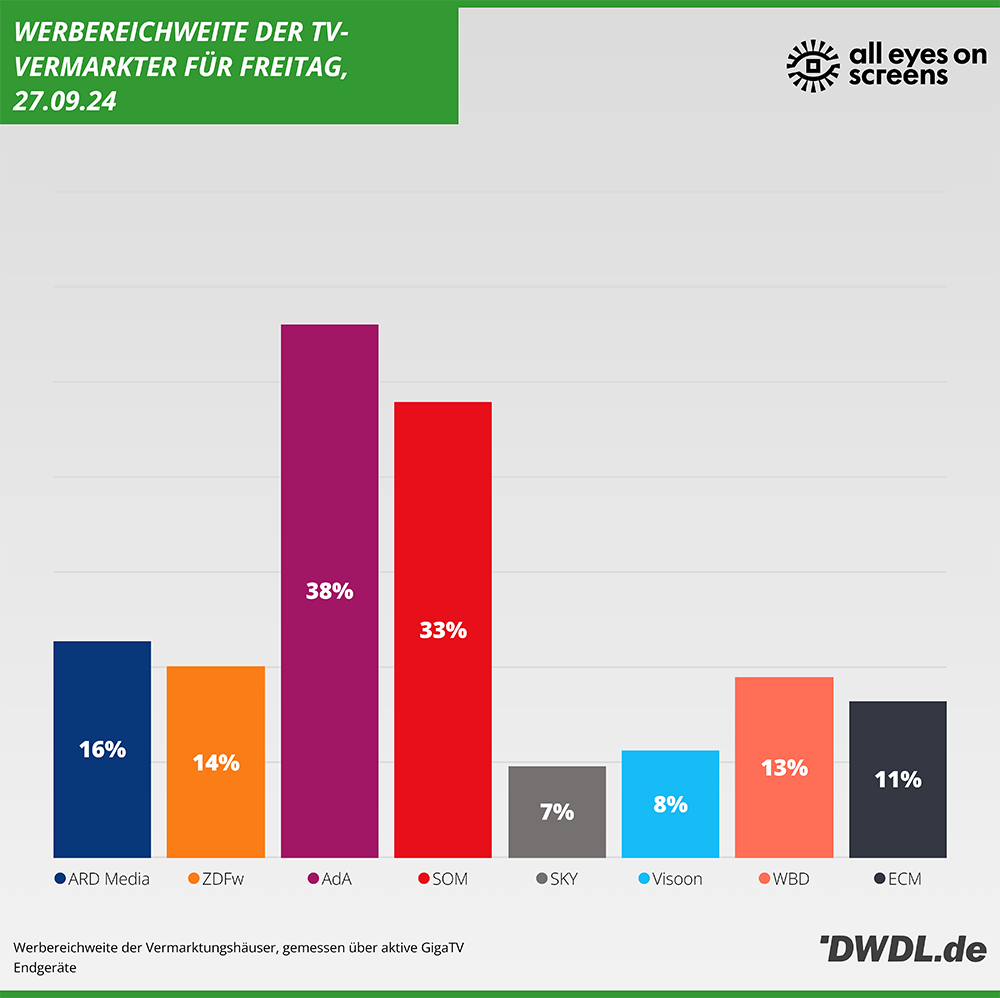 Schon in den letzten Tagen hatte Vodafone seine TV-Werbeaktivitäten etwas intensiviert, so bruttoreichweitenstark wie am Freitag war man aber das ganze Jahr 2024 hindurch noch nicht unterwegs. Mit 278 Spot-Schaltungen erreichte man 121 XRP und musste sich im Ranking damit nur McDonald's geschlagen geben. Den größten Teil der Werbeinvestitonen bekam dabei Vox ab, das damit noch einen größeren Reichweiten-Beitrag zur Kampagne lieferte als RTL. Deutlich übergewichtet war aber auch RTLzwei und Welt. Spannend: Bei ProSiebenSat.1 spielten ProSieben und Sat.1 nur eine sehr kleine Rolle, hier wurde am stärksten Sat.1 Gold belegt, auch Kabel Eins lieferte einen höheren Reichweitenbeitrag als die beiden größten Sender der Gruppe.
