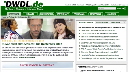 Und schließlich hat sich auch das Medienmagazin DWDL.de vor knapp einem Jahr einen Relaunch verpasst. In der Version 5.0 hat DWDL.de eine horizontale Navigation und den praktischen Newsticker am rechten Rand. Zahlreiche neue Rubriken wurden eingeführt. Auch im kommenden Jahr wird DWDL.de seine Optik dem wachsenden Angebot anpassen.
