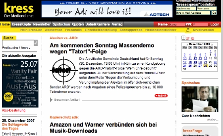 ...hat sich "kress.de" verändert. Das tagesaktuelle Angebot wurde auch für Nicht-Abonnenten geöffnet. Den wichtigsten Themen des Tages werden nun längere Geschichten mit Hintergrundmaterialien gewidmet. Die einzelnen Features wurden überarbeitet, die Video-Datenbank erweitert. Das zum Relaunch eingeführte Redaktions-Blog wurde inzwischen zu einem Info-Angebot für Computer-Spiele umgewidmet.