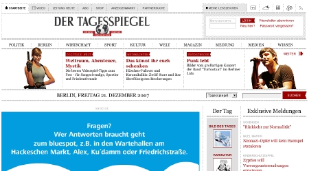 Die Internetvariante des "Tagesspiegel" leitet seit diesem Jahr Mercedes Bunz. Auch dieser neue Auftritt ist luftig und wurde als das erste Newsprotal im Breitformat angepriesen. Man wollte die Haptik der Zeitung auf das Netz übertragen. Neue Darstellungsformen mit Bildern nannte Bunz im DWDL.de-Interview als neuen großen Trend für das Netz.