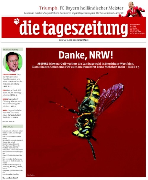 Die linksalternative "taz" kann ihre Freude natürlich nicht verhehlen, titelt euphorisch "Danke, NRW" und bejubelt im unteren Teil der Titel-Seite den "Anfang vom Ende von Schwarz-Gelb". Nett auch das Symbolbild, das man gefunden hat: Eine abstürzende Wespe.