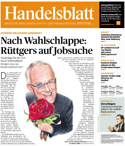 Längst nicht mehr so dröge wie nach manch anderer Wahl präsentiert sich nach der Umstellung aufs Tabloid-Format das "Handelsblatt", dessen Titelseite diesmal von einer Karikatur geprägt wird. Rüttgers als Rosenkavalier, der am Abend mit Löhrmann und Kraft gleich zwei Damen umschmeichelte, um sich womöglich doch noch an der Regierung zu halten - und falls das nicht gelingt auf eine dritte Dame setzt. Das "Handelsblatt" spekuliert schon über einen möglichen Wechsel Rüttgers ins Bundeskabinett.