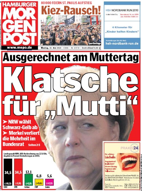 Eine der schönsten Titelseiten kommt aus Hamburg: Dort ist der "Morgenpost" als einziger größerer Zeitung aufgefallen, dass "Mutti" Merkel - so ihr Spitzname im politischen Berlin - die Klatsche ausgerechnet am Muttertag die Klatsche aus NRW erreicht hat. Und der beste - wenn auch wohl unfreiwillige Gag - ist die neben Merkels Gesicht so passend platzierte Werbeanzeige...