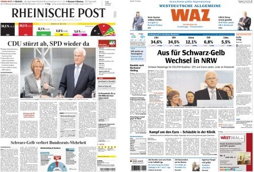 Sachlich und damit auch ein wenig langweilig präsentiert sich die "Frankfurter Allgemeine Zeitung" mit der schlichten Feststellung "Schwarz-Gelb in Nordrhein-Westfalen abgewählt". Auch die Bild-Auswahl darf doch als eher konservativ gewertet werden.