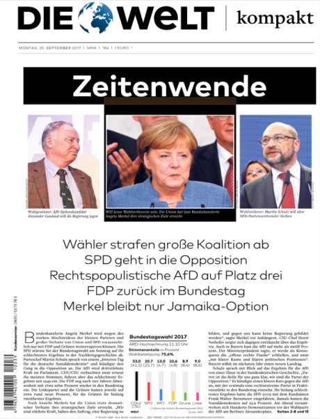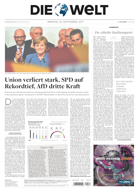 Die lächelnde Kanzlerin gibt's nicht nur bei der "FAZ", sondern auch auf der Titelseite der "Welt" zu sehen - hier hat man sich allerdings dazu entschieden, nicht ausschließlich mit den Verlusten der Union aufzumachen. Stattdessen geht's auch um die Ergebnisse von SPD und AfD. Sonderlich kreativ kommt die Gestaltung allerdings nicht daher.