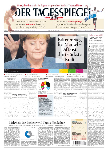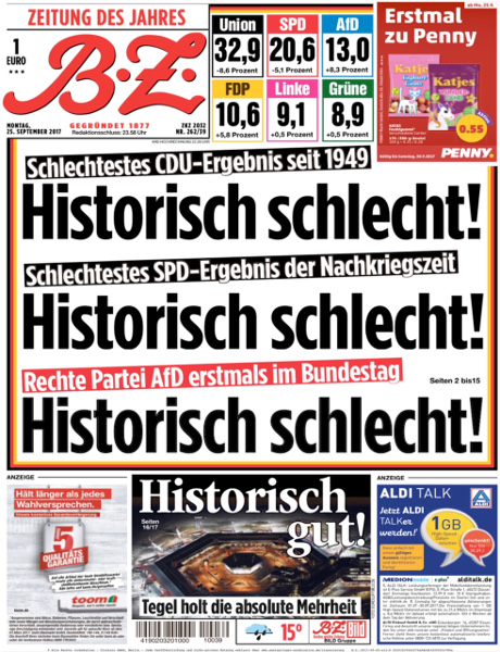 Bei der "B.Z." hat man sich dafür entschieden, keine Personen abzubilden, dafür aber gleich drei Mal die Worte "Historisch schlecht!" auf die Titelseite zu heben - bezogen auf die Ergebnisse von CDU und SPD sowie das Abschneiden der AfD. Als "historisch gut" wird übrigens die absolute Mehrheit bei der Abstimmung bezüglich eines möglichen Verbleibs des Flughafen Tegel bezeichnet. Eine gute sprachliche Klammer.