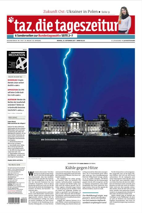 Die "tageszeitung" hat sich dagegen für eine gänzlich andere Gestaltung ihrer Titelseite entschieden: Die Wahl fiel auf ein Foto, das einen Blitzeinschlag im Bundestag zeigt. Klein darunter verweist man darauf, dass die AfD zur drittstärksten Fraktion geworden ist. Passend zum Bild die Überschrift des Kommentars: "Kühle gegen Hitze".