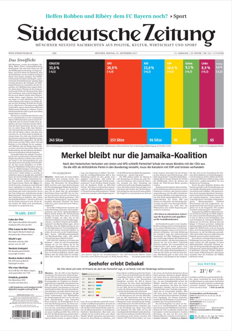 Die "Süddeutsche Zeitung" mag es bunt und hat sich dafür entschieden, das Wahl-Ergebnis auf einen großen Teil der oberen Titel-Hälfte zu packen. Das sticht zumindest ins Auge. Darunter setzt man zwar auf die Kanzlerin in der Überschrift, druckte aber lieber ein Foto ihres Herausforderers ab. Im unteren Teil nimmt die "SZ" pflichtgemäß Bezug auf Bayern und attestiert Ministerpräsident Seehofer ein Debakel.