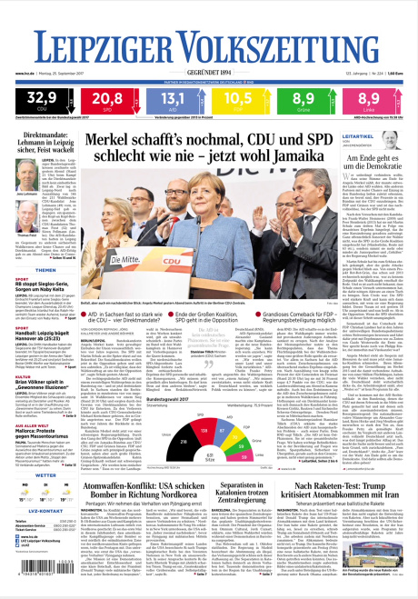 Applaus für Merkel: Für diese Szene hat sich auch die "Leipziger Volkszeitung" entschieden - in der Überschrift gibt's eine kompakte Zusammenfassung der Ergebnisse. Dass die AfD in Sachsen vor der CDU liegt, erwähnt die Zeitung nur klein darunter. Da hätte man angesichts der lokalen Nähe auch andere Prioritäten setzen können.