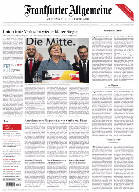 Bei der konservativen "FAZ" gibt's strahlende Gesichter: Zwar wird in der Überschrift auf die Verluste der Union hingewiesen, doch das abgedruckte Foto mit der lächelnden Kanzlerin will nicht so recht passen zum dann doch kräftigen Minus und den wohl nicht ganz leichten Verhandlungen mit FDP und Grünen, die nun bevorstehen.