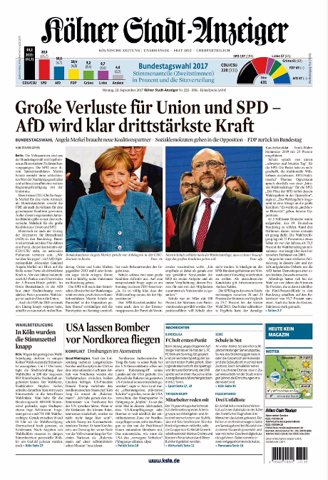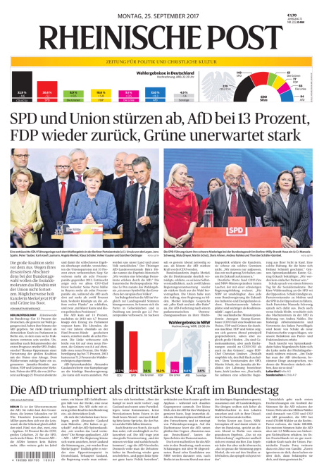 Auch hier eine Bild-Splittung: Links die Kanzlerin, rechts Martin Schulz, der sich an den Kopf fasst. In ihrer Überschrift gehen die Blattmacher der "Rheinischen Post" auf die Ergebnisse aller künftig im Bundestag vertretenen Parteien ein - mit Ausnahme der Linken.