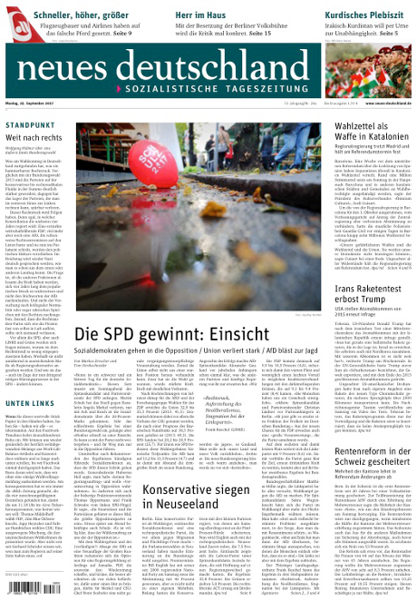 Die sozialistische Tageszeitung "Neues Deutschland" erklärt die SPD kurzerhand zum Gewinner - zumindest, was die Einsicht angeht. Zusammen mit einem auf herbstlichem Wegesrand liegen gebliebenen Schulz-Luftballon ergibt sich ein stimmiges Titelbild, das die Stimmung der Sozialdemokraten am Tag nach der Wahl wohl sehr gut ausdrücken dürfte.