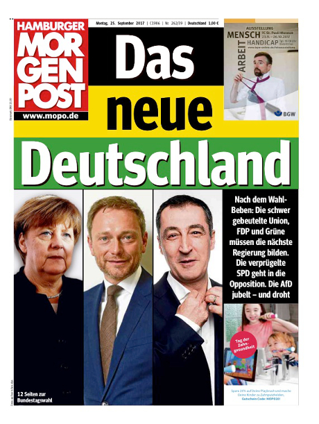 Drei Worte, drei Gesichter: Die "Hamburger Morgenpost" macht die Bundestagswahl großflächig zum Thema und nimmt neben Angela Merkel auch Christian Lindner und Cem Özdemir auf die Titelseite. "Das neue Deutschland" bringt die bevorstehenden Veränderungen eindrücklich zum Ausdruck.
