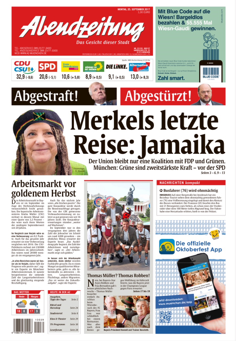 Andere Wege in der Titelseiten-Gestaltung gehen die Münchner Kollegen der "Abendzeitung". Im Mittelpunkt steht Angela Merkel - passend zu den bevorstehenden Koaltionsverhandlungen wird sie auf ihre "letzte Reise" nach Jamaika geschickt. All das sticht ins Auge und hebt die "Abendzeitung" von der Konkurrenz ab. Ebenfalls gut: Mit den klaren Worten "Abgestraft" und "Abgestürzt" liefert das Blatt eine Ein-Wort-Analyse zu CSU und SPD. Auffällig: Das Abschneiden der AfD ist auf den ersten Blick kein Thema.
