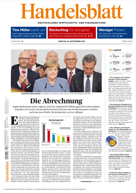 Gleicher Ort, aber ganz andere Tonalität: Auch das "Handelsblatt" setzt auf ein Foto vom ersten Auftritt der Kanzlerin nach Bekanntwerden des Wahlergebnisses. In ihrer Überschrift nennt die Wirtschaftszeitung nicht einfach nur die Zahlen, sondern bewertet den Absturz der Union als "Abrechnung" der Wähler. Meinungsstark und mutig.