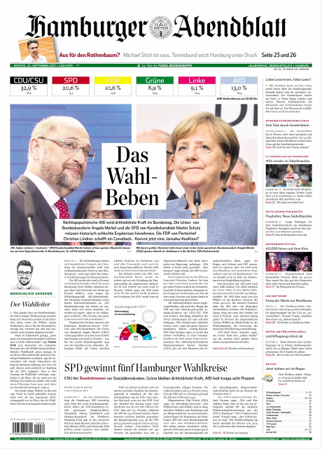 Das "Hamburger Abendblatt" setzt auf enttäuschte Gesichter von Martin Schulz und Angela Merkel und spricht von einem "Wahl-Beben".