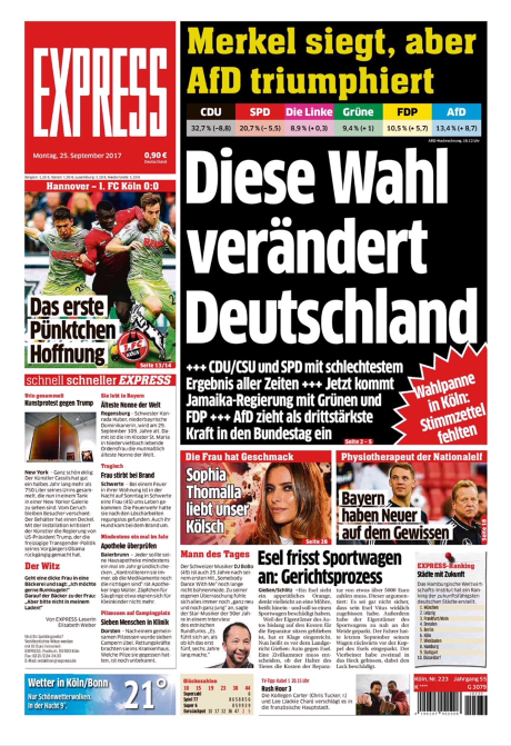 Der "Express" findet angesichts des Wahlergebnisses große Worte und spricht davon, dass die Wahl das Land verändert. Die Gestaltung ist dagegen erstaunlich schlicht: Große weiße Buchstaben auf schwarzem Grund, ein Foto vom Wahlabend gibt's nicht. Das bleibt dem 1. FC Köln vorbehalten.