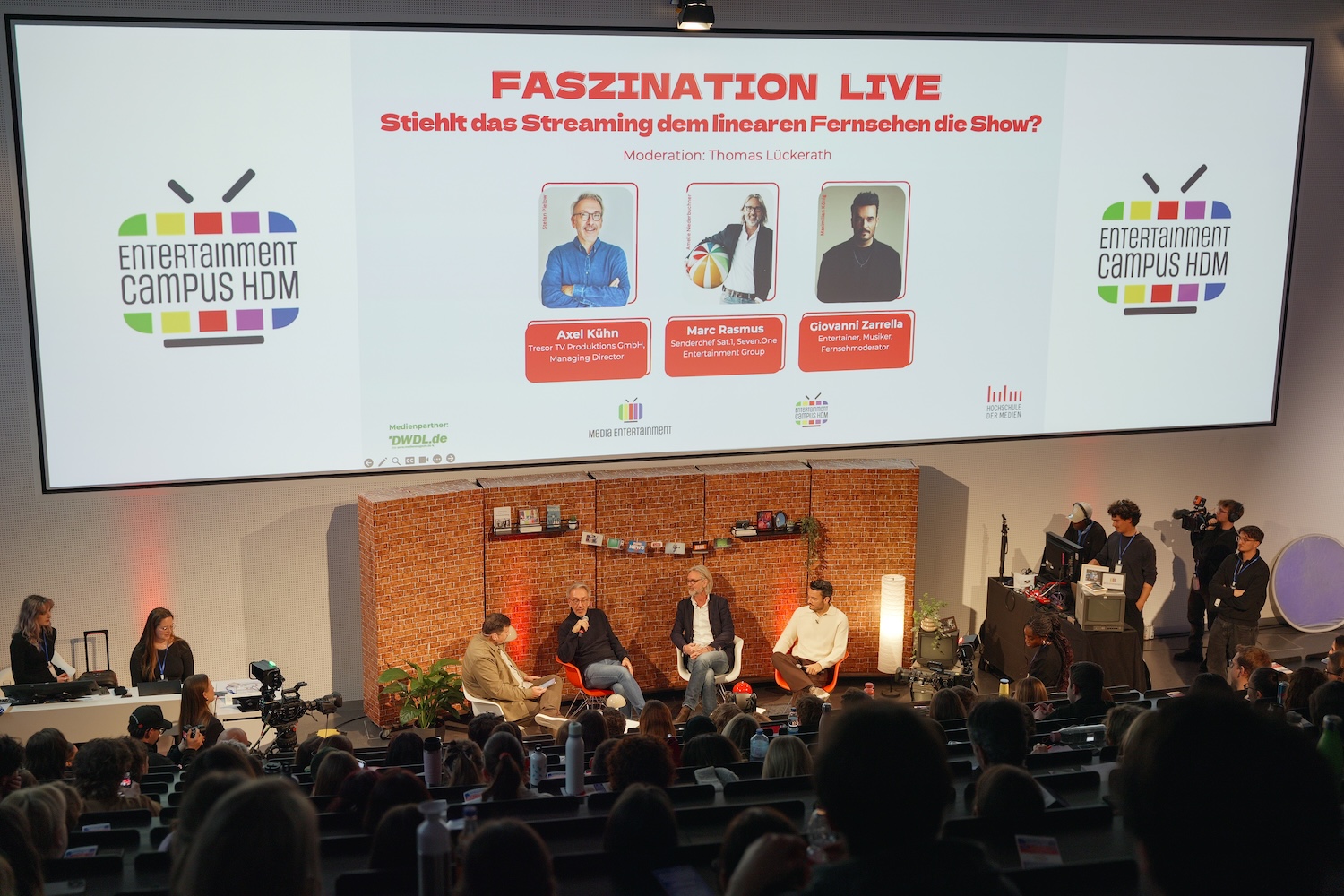 Im ZDF legt man „Wetten, dass..?“ neu auf, bei Netflix klettert Alex Honnold live auf einen Wolkenkratzer. Es hätte kaum eine aktuellere Frage geben können als die nach der Zukunft von Live-Entertainment, mit der am vergangenen Freitag an der Stuttgarter Hochschule der Medien der erste Entertainment Campus eröffnet wurde, der in fünf Panels diverse Themen der Branche ansprach. Ein wilder, schneller Ritt durch aktuelle Herausforderungen. Zu Beginn: Live-Entertainment. Es bleibe die Königsdisziplin mit dem gewissen Adrenalin-Kick und höchster Konzentration, wie es Moderator Giovanni Zarrella von seiner Primetime-Show im ZDF berichtet. Dafür braucht es keinen 500 Meter hohen Skyscraper.