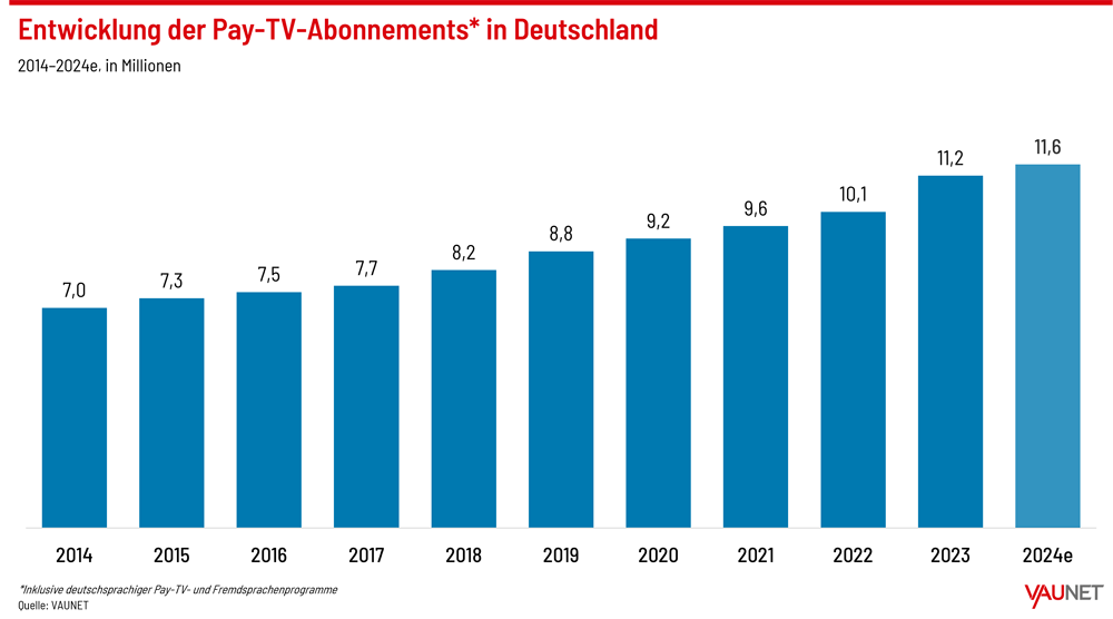 Dies geht jedenfalls aus den aktuellen VAUNET-Zahlen für die Pay-TV/Paid-VoD-Branche hervor. Demnach sollen die Umsätze im klassischen Pay-TV 2024 bei rund 2,2 Milliarden Euro liegen. Damit wächst dieser Bereich zwar seit vielen Jahren nicht mehr, schrumpft aber auch nicht. Seit 2016 bewegt sich der Pay-TV-Umsatz zwischen 2,2 und 2,3 Milliarden Euro. Die Zahl der Pay-TV-Abos steigt sogar: 2022 lag sie erstmals bei über zehn Millionen, 2023 dann schon bei 11,2 Millionen, 2024 werden bis Jahresende 11,6 Millionen prognostiziert. Die Zahl der Pay-TV-Sender liegt übrigens bei insgesamt 111.