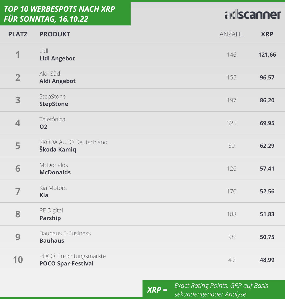 Zwei Discounter warben am Sonntag im deutschen Fernsehen mit Abstand am erfolgreichsten. Die beiden ersten Plätze gingen an Lidl, das 146 Spots schaltete und damit auf einen XRP-Wert in Höhe von etwas mehr als 121 Punkten kam sowie an Aldi. Aldi sicherte sich 96,6 Punkte – und setzte dafür 155 Spots ein.