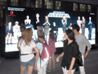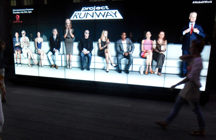 © M. Müller Im Abschnitt auf Höhe der 15./16. Straße ließ Lifetime diese interaktive Leinwand-Installation aufbauen, die die komplette Jury samt Heidi Klum zeigte, wie sie die vorbeilaufenden Passanten beurteilt und teilweise euphorisch aufsteht und klatscht. Die Menschen sollten das Gefühl vermittelt bekommen, Teil eines virtuellen Catwalks zu sein und von Heidi Klum persönlich kritisch begutachtet zu werden. Tim Nolan, SVP Marketing, Creative & Brand Strategy von Lifetime Networks, gab in einem Interview mit dem Hollywood Reporter Details zu dieser und weiteren Marketingmaßnahmen zur Jubliäums-Staffel von "Project Runway" preis: "Diese einzigartige interaktive Leinwand-Installation gibt es bisher nur zweimal auf der Welt und wurde erstmals auf einer Messe in Asien kürzlich zum Einsatz gebracht. Jeder will einmal ein Fashion-Star sein und die Erfahrung machen, einmal auf dem Catwalk zu laufen - somit werden die Fans direkt von Heidi Klum Zustimmung oder Ablehnung erfahren." Fünf Tage lang konnten die Besucher des High Line Parks diese Leinwand-Installation betrachten und am Dienstag vor der Premierenfolge wurde zusätzlich an dieser Stelle eine große "Project Runway"-Party veranstaltet. Die Strategie des Lifetime-Marketingteams ging in der Tat auf, da auffallend viele Passanten vor dieser originellen interaktiven Werbeform stehenblieben und mit Staunen verfolgten, was es mit dieser Aktion auf sich hat. Spätestens nach zwei Minuten wurde dann aber klar, dass es sich um eine Schleife handelte und alle Jurymitglieder wieder auf der Couch Platz nahmen.