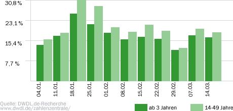 Zurück zu RTL: Dort lief dann auch "Stern TV", das diesmal wegen der Überlänge von "Let's dance" erst gegen 22:30 Uhr startete, unspektakulär, aber ebenfalls nicht schlecht. 18,3 Prozent betrug der Marktanteil in der Zielgruppe, insgesamt hatten 2,78 Millionen Zuschauer eingeschaltet.