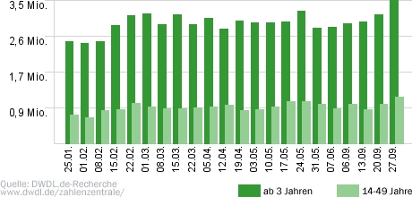 Auch in der Zielgruppe der 14- bis 49-Jährigen lief es so gut wie lange nicht mehr, auch wenn man hier keinen neuen Rekord aufstellen kann. Und doch lief es mit 1,11 Millionen Zuschauern sehr gut. Möchte man einen höheren Wert finden, muss man bereits bis in den Oktober vergangenen Jahres zurückblicken. 12,8 Prozent beträgt der Marktanteile in dieser Woche in dieser Altersgruppe.