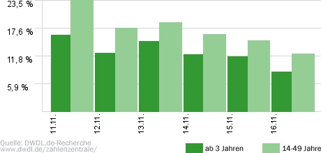 Quelle für alle Daten in diesem Artikel, sofern nicht anders vermerkt: AGF SCOPE 1.9; Marktstandard: Bewegtbild; vorläufig gewichtete Daten; Tages-MA: Auswertungstyp TV-Zeitintervall; nutzungsbezogen; Sendungsdaten: Auswertungstyp TV; produktbezogen;